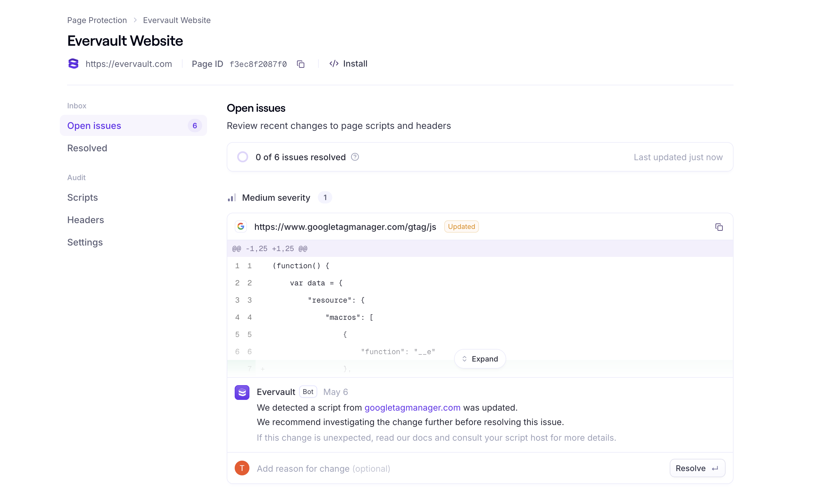 Page Protection will create an audit-ready inventory of all scripts loaded on your page. You can easily authorize and justify each script (requirement 6.4.3) and generate audit reports on demand to demonstrate PCI DSS 4.0 compliance.